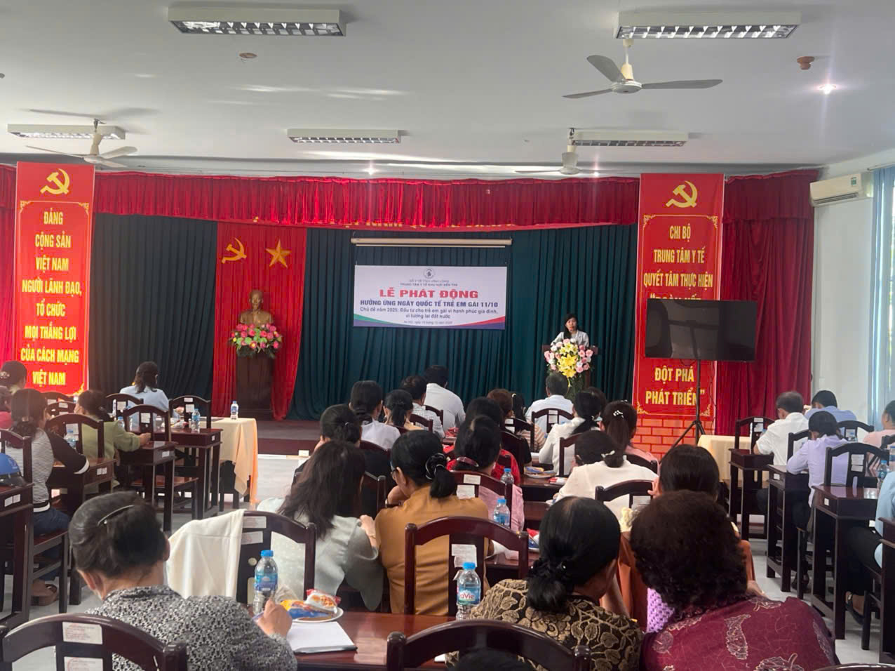 (Lãnh đạo Trung tâm Y tế khu vực Bến Tre phát biểu phát động hưởng ứng Ngày Quốc tế trẻ em gái 11/10)
